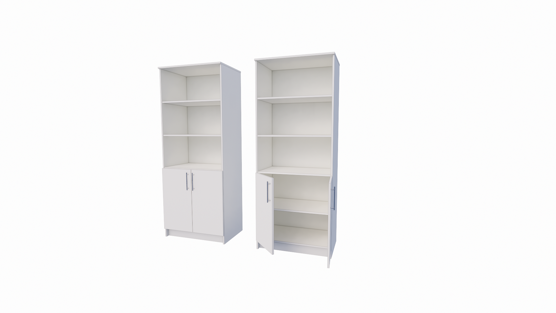 Korpus ormara – bočne stranice, strop, pod i police – izrađeni su od iverala debljine 18mm sa niskom emisijom formaldehida (dokumentovano certifikatima EN 312 i EN 14322 uz ponudu) sa melaminskom zaštitom koja omogućava postojanost boje, otpornost na površinska oštećenja, hemijske uticaje, termička i mehanička opterećenja, te jednostavno održavanje. Svi rubovi korpusa zaštićeni su ABS trakom 0,8 mm upotrebom PUR ljepila. Stranice ormara su do poda, oslonjene na plastične nivelirajuće noge pojedinačne nosivosti 100 kg/kom visine 100 mm, koje se mogu podešavati kroz pod ormara, sakrivene cokl maskom visine 100 mm. Poleđina ormara je izrađena od HDF-a bijele boje debljine 3 mm. Sa unutrašnje strane bočne strane ormara imaju napravljene rupice za montažu sigurnosnih držača polica, što omogućava podešavanje razmaka polica prema potrebi. Nosači polica su napravljeni tako da su fiksirani u stranice i police, zbog čega je nemoguće da police ispadnu iz ormara, što čini posebnu zaštitu za korisnika. Ormar je podijeljen na 5 jednakih dijelova, sa 4 police. Dvoja vrata ormara su izrađena od identičnog iverala sa melaminskom zaštitom ukupne debljine 18 mm kao i korpusi ormara. Svi rubovi vrata ormara zaštićeni su ABS trakom 2 mm upotrebom PUR ljepila. Vrata su opremljena sa visokokvalitetnim baglamama sa ublaživačima i podloškom za 3D podešavanje vrata proizvođača Hefele. Drugi dio ormar je otvoren. Sadrži 2 metalne ručkice. Opcionalno, ormar može sadržati sigurnosne bravice sa dva ključa.