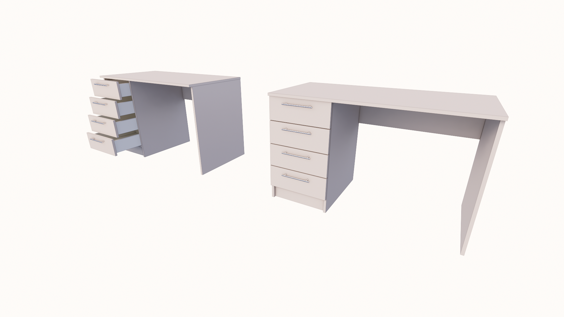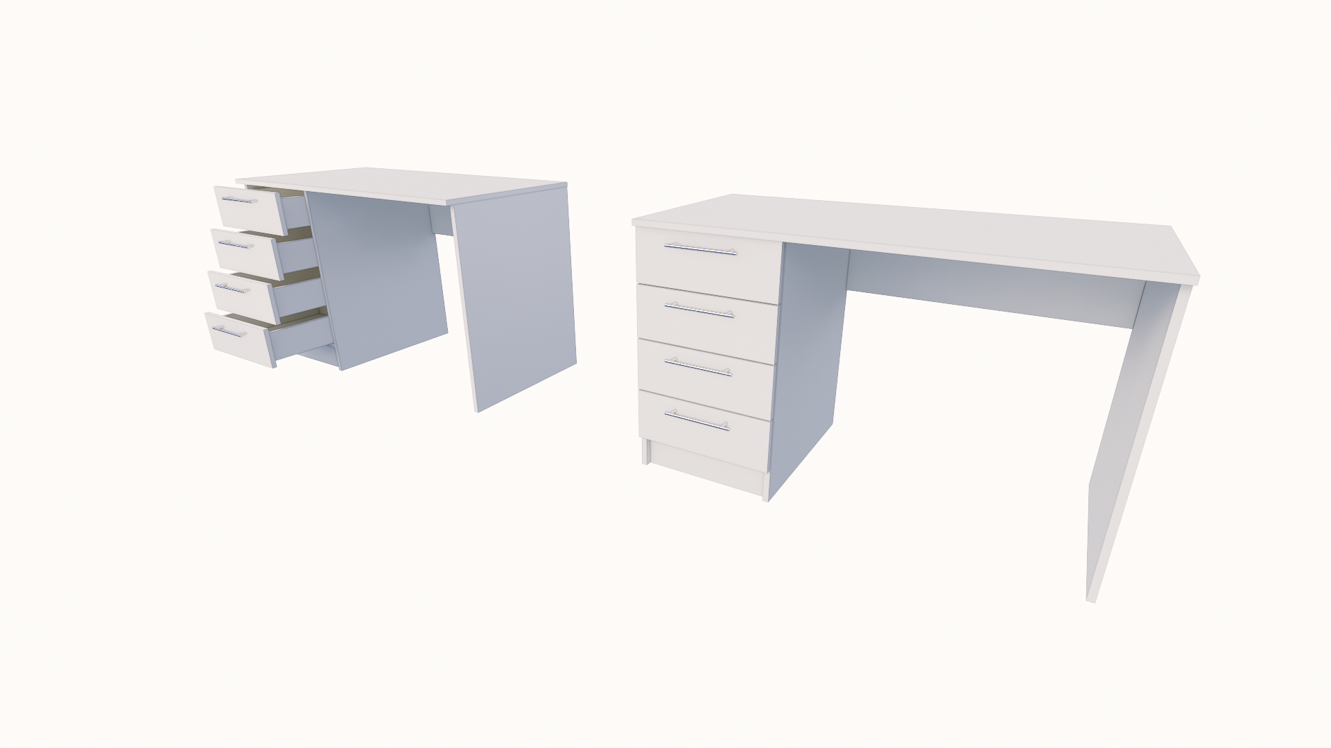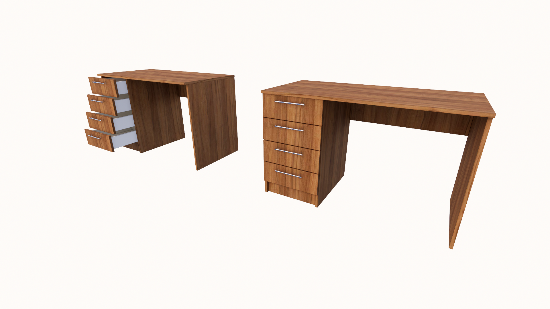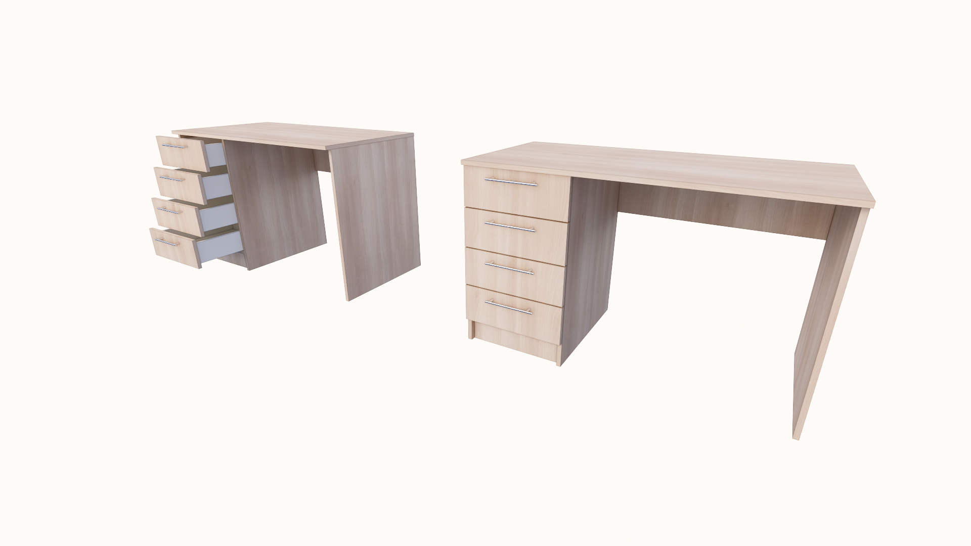 Uredski radni stol sa 4 ladice izrađen je od iverala debljine 18mm sa niskom emisijom formaldehida (dokumentovano certifikatima EN 312 i EN 14322 uz ponudu) sa melaminskom zaštitom koja omogućava postojanost boje, otpornost na površinska oštećenja, hemijske uticaje, termička i mehanička opterećenja, te jednostavno održavanje. Svi rubovi korpusa zaštićeni su ABS trakom 0,8 mm upotrebom PUR ljepila. Stranice uredskog stola su do poda, oslonjene na plastične nogice visine 5 mm, Stol sadrži 4 ladice za pohranu dokumentacije. Mogućnost narudžbe desne i lijeve strane. Sadrži 4 metalne ručkice. Opcionalno, stol može sadržati sigurnosnu bravicu sa dva ključa na ladici, kao i rozetu za kablove.